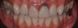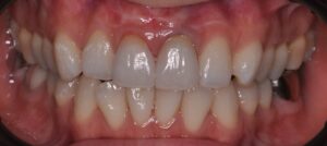 話を聞くと、1ヶ月ほど前に向かって右の前歯のセラミック治療したが、その後歯根の先を切る手術をしたら歯茎が痩せて(歯肉退縮)その結果歯茎の部分が黒くなってきたとのことでした。